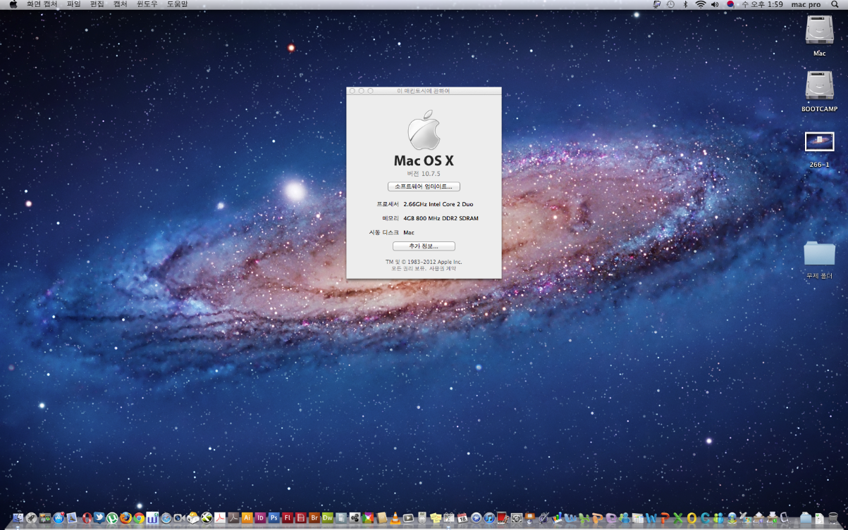 하드를 반으로 나눠 부트캠프로 윈도우즈7 설치했습니다 한글등 설치됨